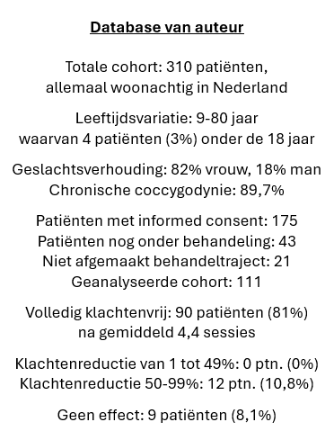 De klinische resultaten van deze laagdrempelige, kostenefficiënte en causaal gerichte behandeling, doen daarbij niet onder voor die van de medische interventies. Uit de database van de auteur, die zich heeft gespecialiseerd in de uitwendig mobiliserende behandeling van coccygodynie, blijkt dat circa 80% van de patiënten binnen doorgaans slechts enkele sessies volledig klachtenvrij wordt.